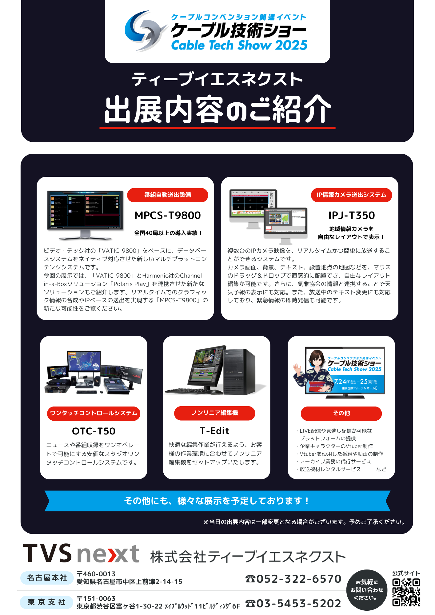 今回の展示内容としましては、「コミチャン運用サポート」をテーマとし、全国40局以上で採用されている番組自動送出設備「MPCS-T9800」や、放送用表示画面を自由にカスタマイズ可能なIP情報カメラ送出システム「IPJ-T350」、お客様の作業環境に合わせてセットアップするノンリニア編集機「T-Edit」、その他にも企業キャラクターのVtuber制作や、アーカイブ業務の代行サービス、放送機材レンタルサービスなど多種多様な展示いたします。